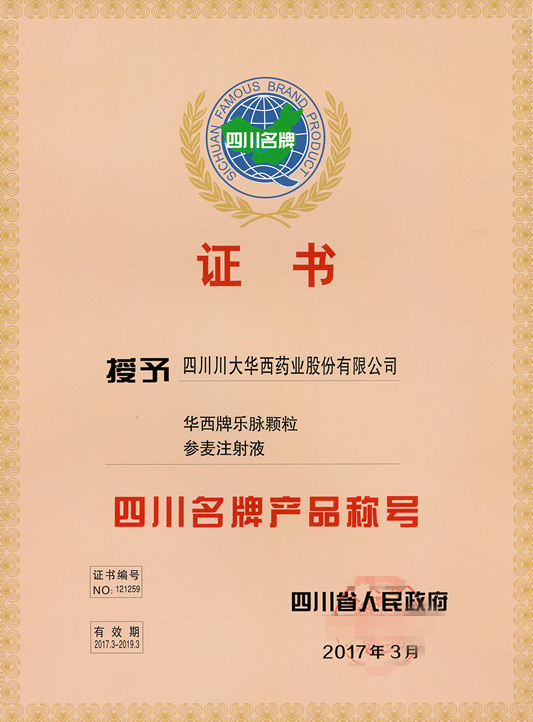 我公司华西牌乐脉颗粒、参麦注射液在2009年获四川省人民政府授予的第九届“四川名牌产品”称号,2017年经复查确认再次荣获第十二届“四川名牌产品”称号。
